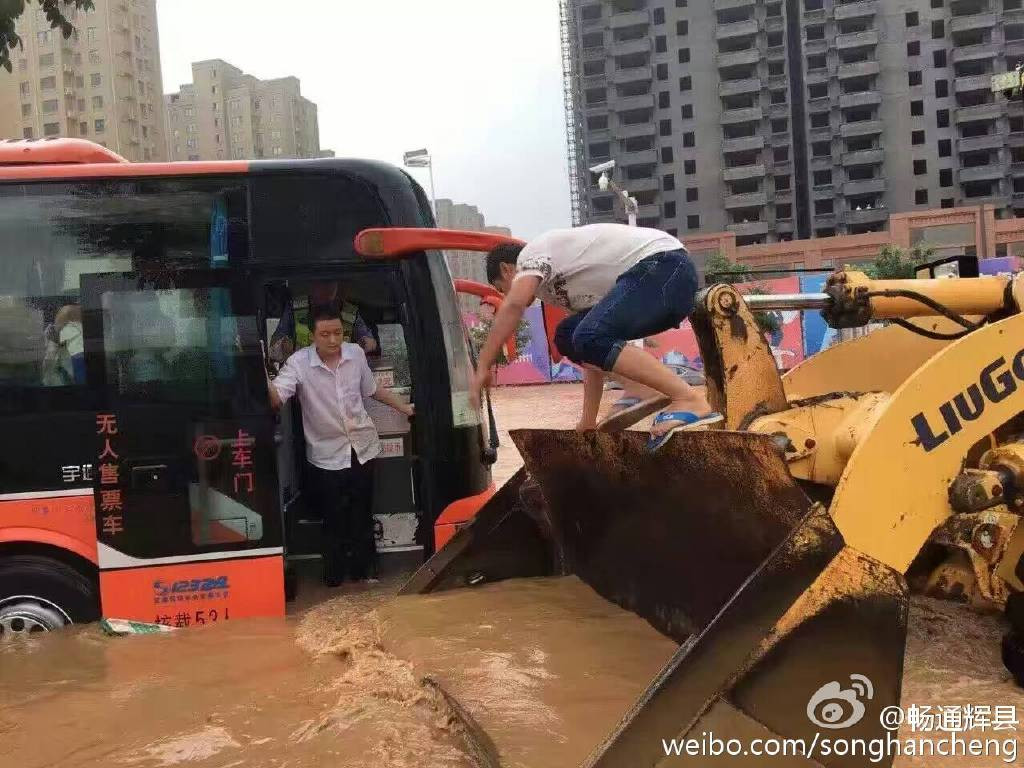 河南辉县暴雨后 挖掘机解救公交乘客
