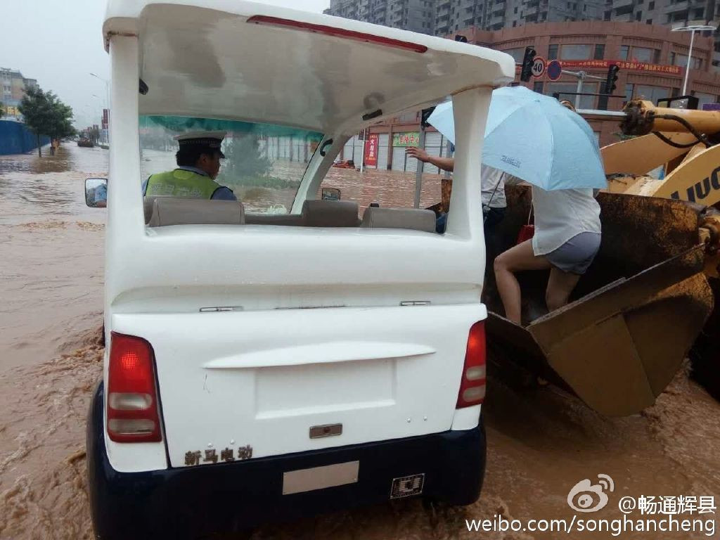 辉县市公安交警大队官方微博发布图片显示,辉县市出现渍涝,水位直达腰部,一辆挖掘机解救了一辆公交车上的乘客。