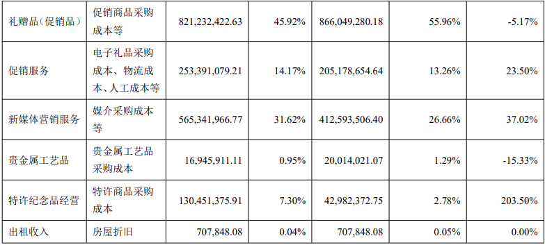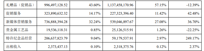 元隆雅图将业务分为营销和特许及其他两大类,前者又可分为礼赠品、促销服务与新媒体营销,后者分为贵金属工艺品、特许纪念品等。
