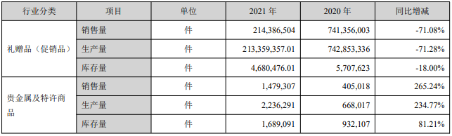 2021年,元隆雅图卖出的贵金属及特许商品有147.93万件,同比增加265.24%,主要是由于冬奥会特许商品销量上升;生产量为223.63万件,同比增加234.77%,主要是由于冬奥会特许商品产量上升;库存量同比增加81.21%。4月份,元隆雅图表示,公司增开大量模具积极扩大产能并持续大量生产交付冰墩墩冬奥特许商品,公司的冬奥特许商品销售渠道包括天猫奥林匹克官方旗舰店、线下冬奥特许零售店、中国银行线上线下渠道(贵金属产品)、冬奥会合作伙伴或赞助商定制等。冰墩墩和冬奥的“爆火”,主要发生在今年。可以预见的是,元隆雅图2022年的特许商品业务,将有更好的数字表现。业绩预告显示,元隆雅图预计2022年一季度净利润9000万元-1亿元,同比增长217.82%-253.13%。净利大增的主要原因就是冰墩墩等特许商品大卖。
