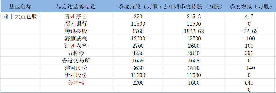 从持仓来看,张坤在一季度依然是高股票仓位操作,重仓股的调仓幅度不大。易方达蓝筹精选的前十大重仓股中,除了新增美团-W(03690.HK)取代平安银行(000001.SZ)外,其余9只重仓股均未变,只是持股数量有所调整。