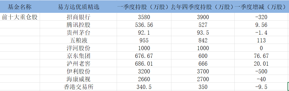 自去年9月调整为为QDII基金,截至一季度末,易方达优质精选投资港股通的港股市值为36.6亿港元,占净值比例为21.7%。从前十大重仓股的持仓来看,并没有新进个股,只是在持股数量上有所增肌。其中,易方达优质精选一季度减持了500万股伊利股份(600887.SH)、减持了320万股招商银行(60036.SH),加仓了113万股五粮液(000858.SZ)。