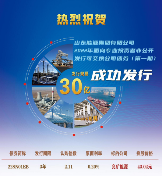 2022年4月19日,山东能源集团于上海证券交易所发行的可交换公司债券(以下简称“本次发行”)成功定价,标的股票为兖矿能源A股股票(600188.SH)。债券期限为3年,发行规模30亿元,换股价格达到43.02元/股,超过上市公司历史最高股价。本期可交换债券是山东能源集团联合重组后在交易所市场的首次亮相,市场机构投资踊跃、换股价设定创新高,对股价长线走强起到指引作用,体现了投资者对山东能源资质和兖矿能源股价预期的认可。