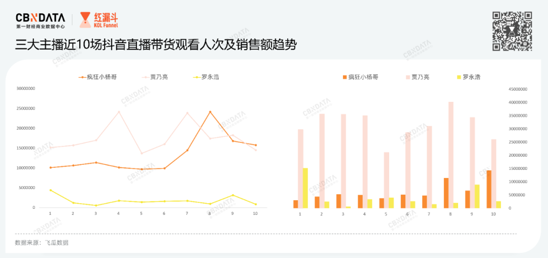 作为一个并不专业的主播,小杨哥却凭借自己的“疯狂人设”做到了抖音头部带货主播的程度。CBNData对比了他和另外两位头部主播贾乃亮、罗永浩的直播间观看数据发现,在观看人次上,疯狂小杨哥与贾乃亮相差不大,甚至在近几场直播中人气超过贾乃亮;在销售额上,小杨哥虽不及贾乃亮,但其GMV有不断上升之势,最近一场GMV高达1428万。相比之下,曾被称为“抖音一哥”的罗永浩直播数据却逊色不少。值得一提的是,小杨哥不像两位头部主播规模化全天候的直播形式,而是一周仅播2-3次,每次时长不超过3小时。