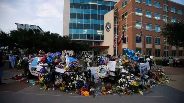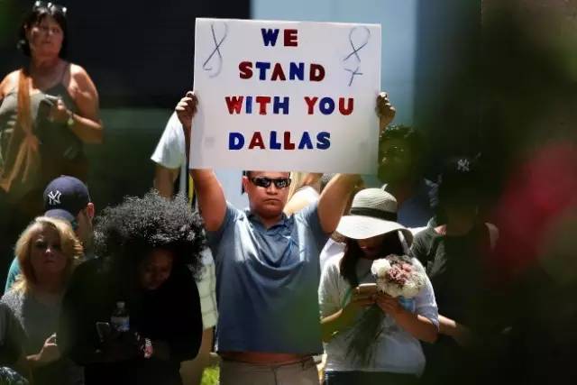 民众8日聚集在达拉斯感恩广场悼念殉职警员。(路透)