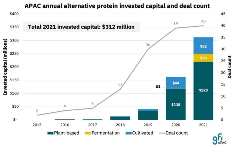 聚焦亚太地区,替代蛋白的同比增长同样强劲,从2020年的1.62亿美元飙升至2021年的 3.12 亿美元(增长 92%)。 其中,新加坡初创公司Next Gen Foods以创纪录的3000万美元种子轮融资受到世界关注。