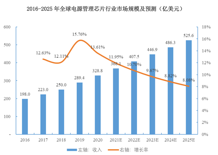 行业上,Frost&Sullivan数据显示,2016年至2025年全球电源管理芯片收入增速将不断下滑。中国电源管理芯片厂商目前的市场占有率仍然相对较低。2020年,中国前十大本土电源管理芯片设计企业的市场份额合计仅为7.51%。