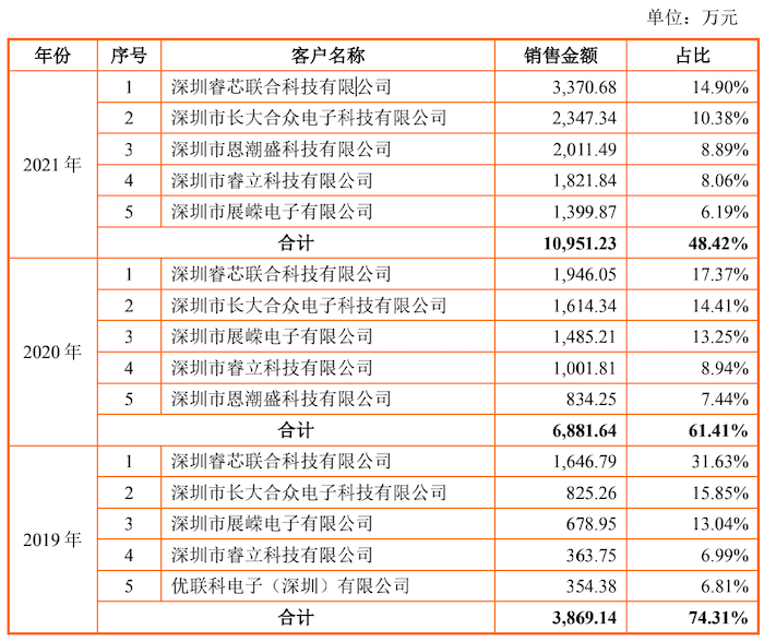 报告期,智融科技前五大客户也是经销商客户,来自前五大经销商客户销售收入合计占营业收入的比例分别为74.31%,61.41%和48.42%,集中度较高。值得注意的是,智融科技前五大经销商客户均系深圳市的公司。