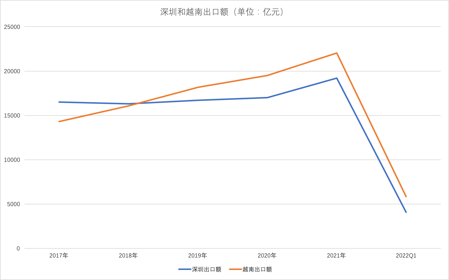 以2021年为例,深圳出口1.92万亿元,增长13.5%,但与越南去年出口额3362.5亿美元(22046亿元)相比,仍然落后约2800亿元。