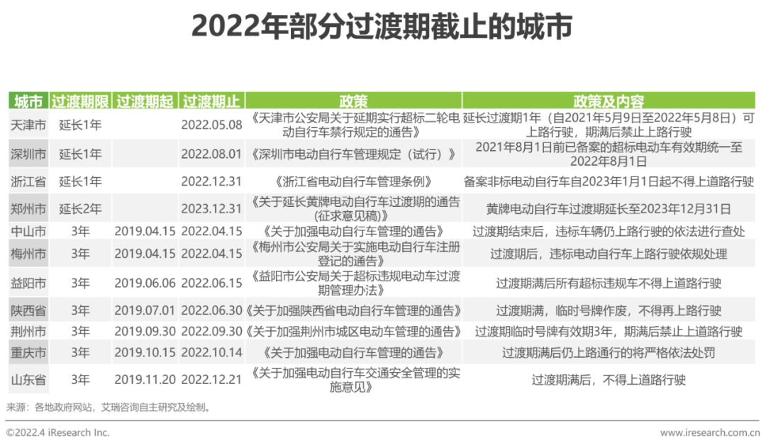 2022年是《新国标》政策实施的第三年,多城市过渡期临时牌照失效或即将失效,两轮电动车迎来新一轮换购利好小高峰。2018年1月16日工信部发布《电动自行车安全技术规范》(GB 17761-2018)要求自2019年4月15起强制实施,对2019年4月15日前购买不符合《新国标》的两轮电动车实行3-5年过渡期管理。其中,北京、上海、天津,及广东省、浙江省、江苏省、福建省、广西省、江西省等多地明确规定,过渡期内未上牌或过渡期满后登记为临时牌的两轮电动车禁止上路行驶。同时,在民情需要、有序清退原则下,小部分城市采取了过渡期延长或限制骑行区域的方式对超标车进行管理,在此种情形下,该城市的换购增长可能不明显。