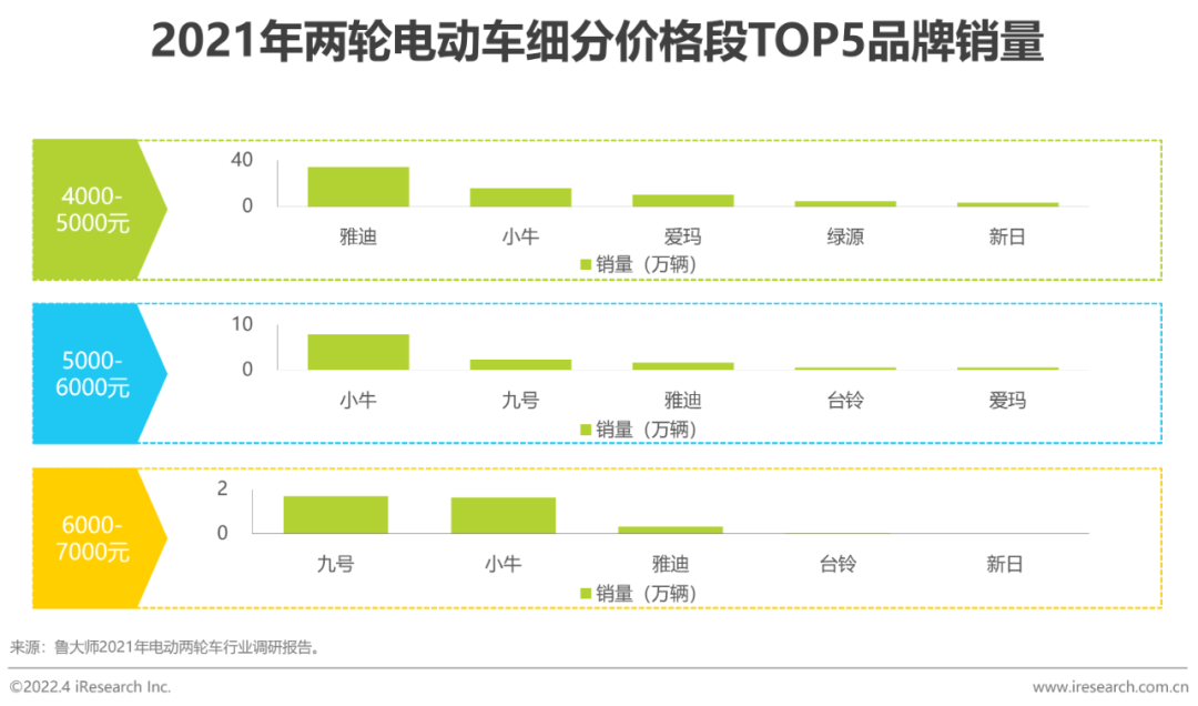 目前,两轮电动车低价格段车型比较集中,以传统品牌为主,低端经济车型、性价比车型、性能车型常常是传统品牌的热销主力车型;随着两轮电动车的智能化发展,雅迪、爱玛、台铃、新日等传统品牌也大力推出“智”版车型。新势力品牌如小牛、九号则以智能化车型为主,价格相对较高,市场销售规模远不及低价段车型规模,未来价格相对适中、兼具性能与智能的车型市场空间会更大。