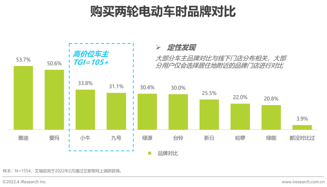 多数车主购买两轮电动车时会货比三家,高价位车主考虑九号、小牛的行为更突出