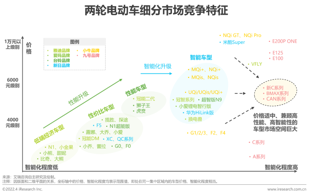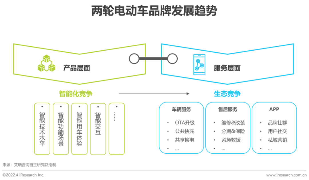 一方面,国内两轮电动车市场早已成熟,《新国标》集中替换期结束后,品牌的生存竞争问题将进一步凸显,历史以产品为主导,以价格战促销量的竞争方式显然已难以为继。另一方面,智能化为两轮电动车打开新局面,以研发智能两轮电动车为主“造车新势力品牌”鲶鱼,搅动传统品牌在智能化方向上进行革新,未来国内的两轮电动车的市场竞争将逐渐导向产品智能化竞争以及基于智能两轮电动车的服务生态的竞争。