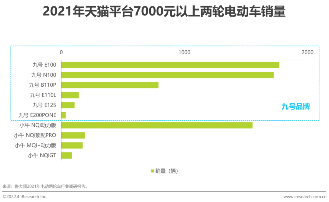 从天猫平台销量来看,7000以上高端价格的车型中,九号品牌更受消费者喜爱,产品销量更高。