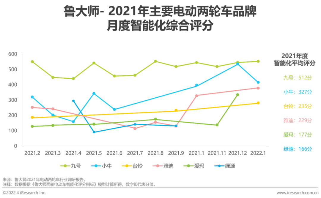 总体来看,2021年两轮电动车智能化水平提升明显,产品在车辆状态采集与硬件管理、车辆交互传输系统、驾驶辅助系统、能源系统、防盗系统等方面有较大提升。分品牌来看,根据鲁大师对电动两轮车主要品牌智能化评分标准,目前主流品牌大多智能化评分较高,九号、小牛的智能化评分在全年大多数月份领先于其他品牌;九号全年综合智能化评分水平更高。