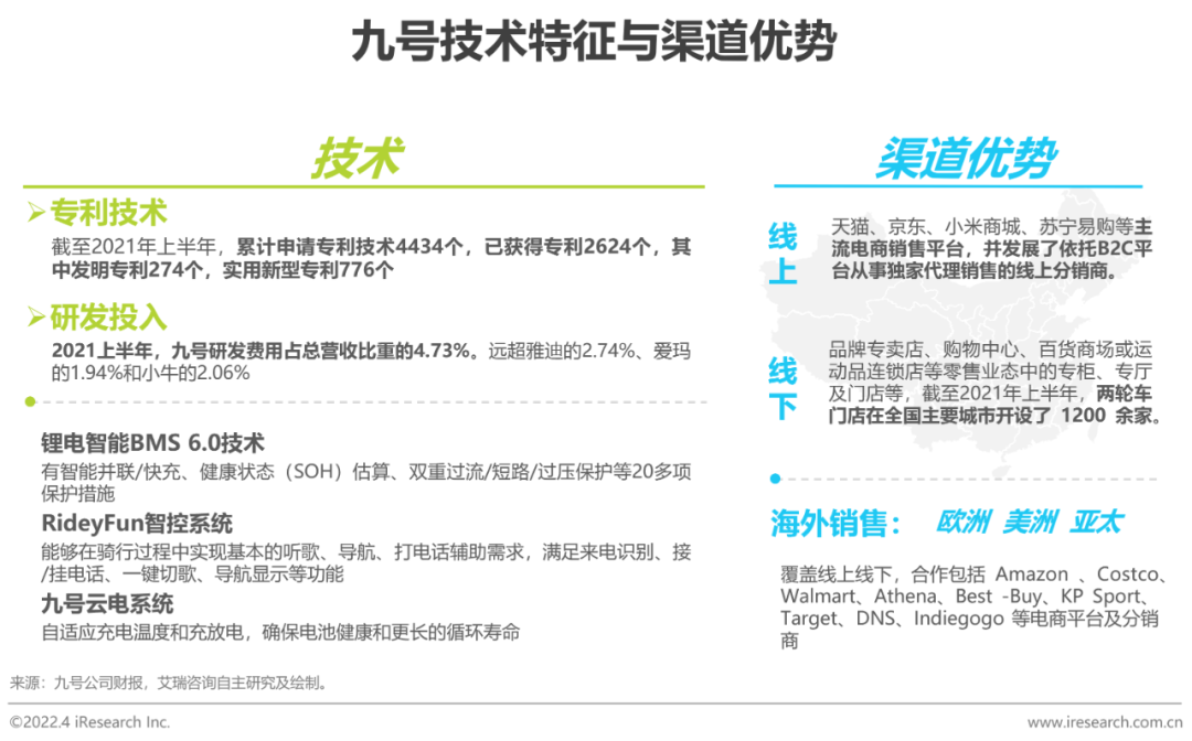 九号的研发投入比例是最高的一家公司,在智能短交通领域拥有全球领先的知识产权储备,其进行智能化的决心与实力不可小觑。此外,九号已在全球市场进行多渠道布局,构建强大的营销团队,形成线上与线下相结合的立体式营销渠道,实现了对各市场的全面覆盖,提高了产品销售的渗透力,并建立起与销售渠道相匹配的售后服务体系。