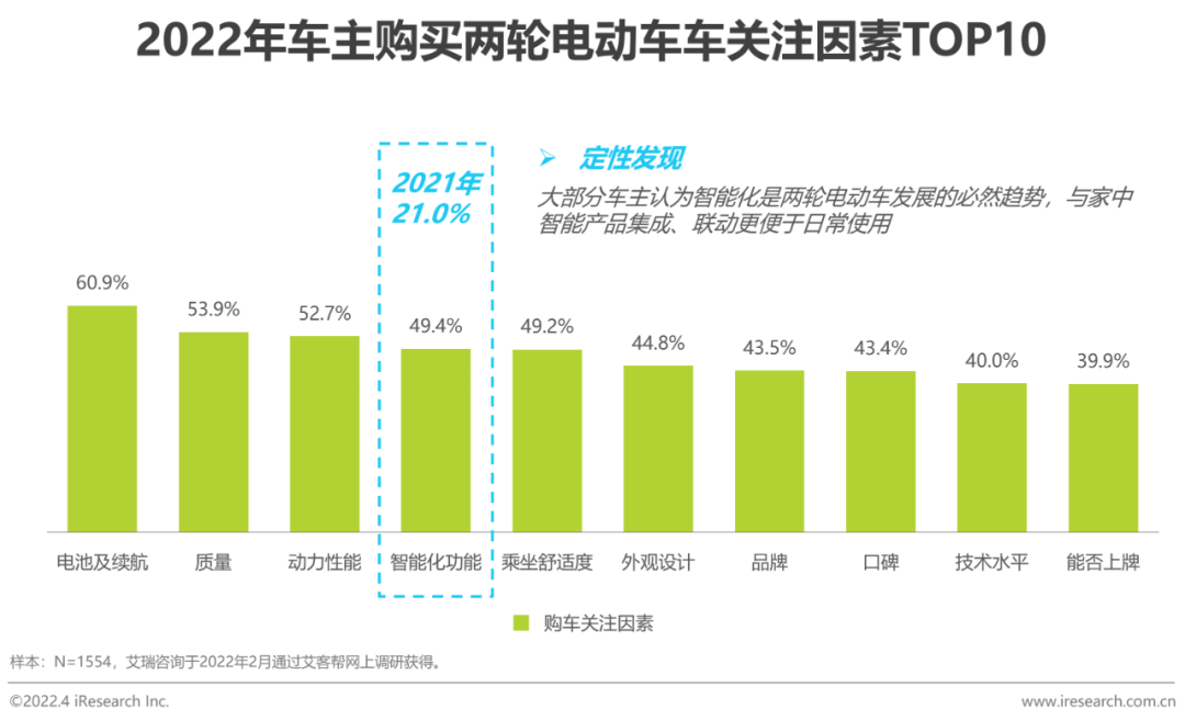 车主购车最主要的关注因素依然是电池及续航、质量和动力性能。同时车主对于智能化的需求也值得重视,相比于上一年,仅21%的车主在购车时关注智能化功能,今年智能化功能需求度达49.4%,跃进到第四位,足以证明两轮电动车智能化发展的必要性。