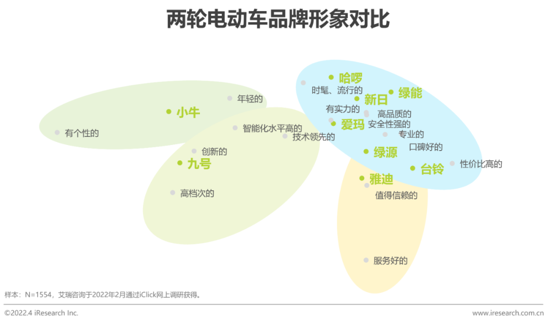 从消费者角度来看,传统两轮电动车品牌如爱玛、新日、绿能等品牌,品牌形象同质化严重,没有突出特征。仅雅迪凭借规模大、创立时间久,使得消费者对其“值得信赖”、“服务好”和“专业”等形象更为认可。