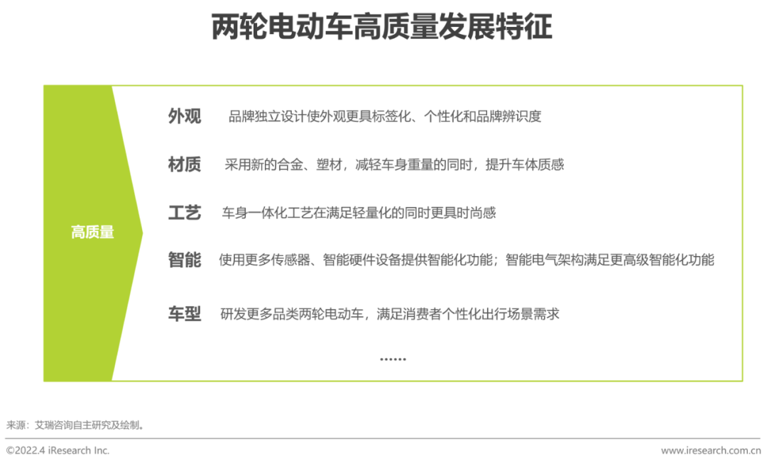 在“高质量发展”时代背景驱动及消费升级需求推动下,两轮电动车向高品质、智能化、个性化发展。例如,在外观设计上采用更多品牌独立设计,使产品具有像汽车外观一样的品牌标签与辨识度。使用轻量化材料,采用一体化加工工艺,使车辆更轻更有质感。搭载性能更好的传感器、智能硬件使电动车具备更好的主动安全、智能便捷性等。研发不同种车型,如电动滑板、电动平衡车、超大功率电动摩托车等,满足不同用户群体,在城市通勤、其他交通工具接驳等不同出行场景下,或者跑山、越野、骑行社交等个性化出行场景下的用车需求。