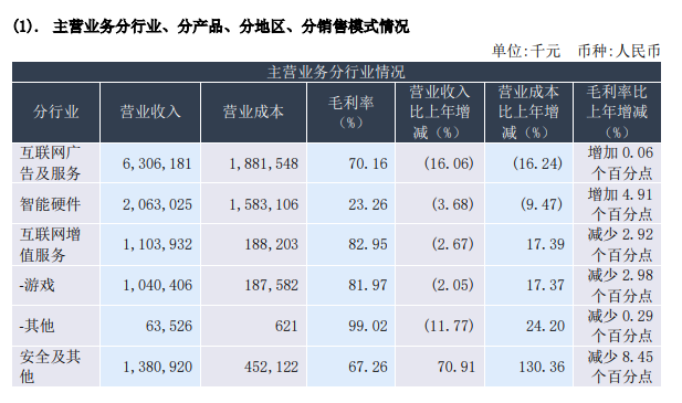 其中互联网广告及服务收入为63.06亿元,同比下降16.06%;智能硬件业务收入20.63亿元,同比下降3.68%;互联网增值服务收入11.04亿元,同比下降2.67%;安全及其他业务收入为13.81亿元,同比增长70.91%。