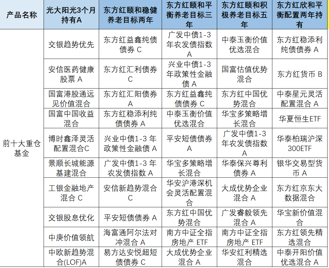 东方红颐和平衡养老目标三年、东方红颐和积极养老目标五年、东方红欣和平衡配置两年持有3只产品的前十大重仓基金中,来自于自家公司的分别有2只、1只、4只。