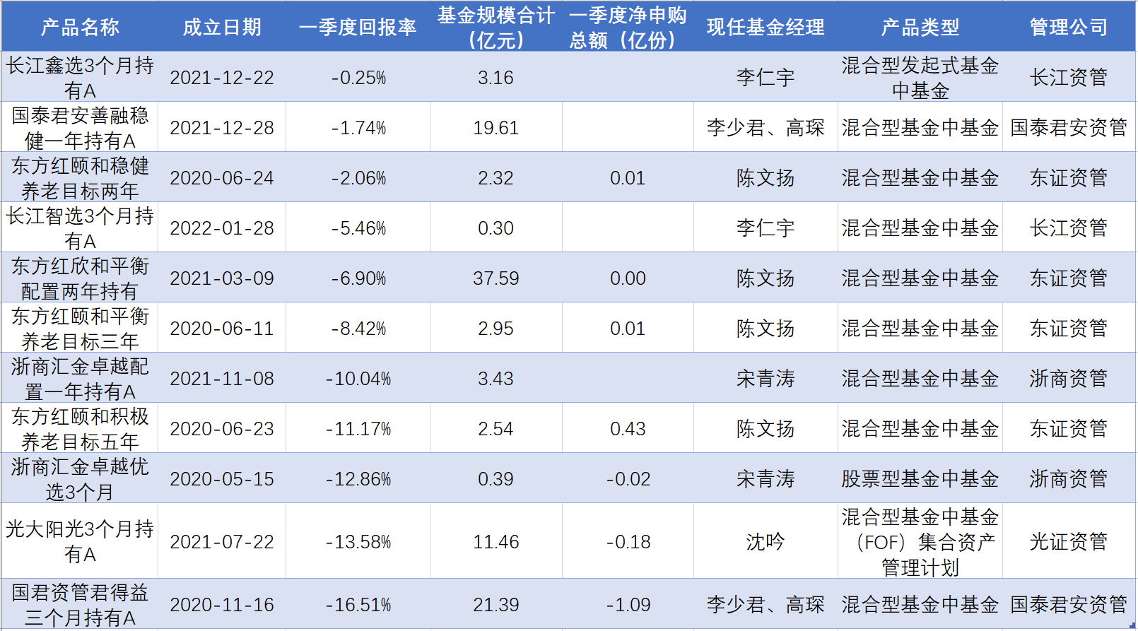 界面新闻记者整理东证资管、国泰君安资管、长江资管、浙商资管、光证资管旗下11只FOF产品一季报发现,未有一只产品在一季度实现正收益,其中回撤最小的是长江资管李仁宇管理的长江鑫选3个月持有A,一季度回报率-0.25%;回撤最大的是国泰君安资管李少君、高琛共同管理的国君资管君得益三个月持有A,一季度回报率-16.51%。