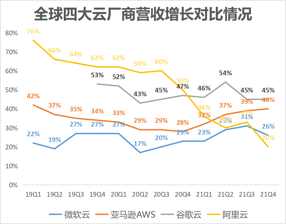 根据财报,阿里云在2022财年三季度(即2021年四季度)收入增速降至20%,这也是阿里云公布业绩数据以来的最低增速。全球数据方面,阿里云也被谷歌夺了全球第三的宝座,以不足6%的份额位居第四。