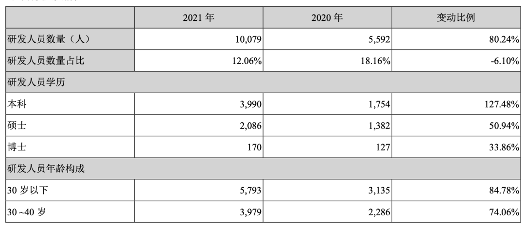宁德时代在2021年也实现了人员的快速补充,已经拥有10079名研发人员,同比增长幅度达到了80.24%,研发人员占比为12.06%,但由于整个公司员工快速增加,研发人员占比同比下降了6.1%。在这10079名研发人员中,本科学历为3990人,同比增长127.48%,研究生学历为2086人,同比增长了50.94%,博士学历为170人,同比增长了33.86%。