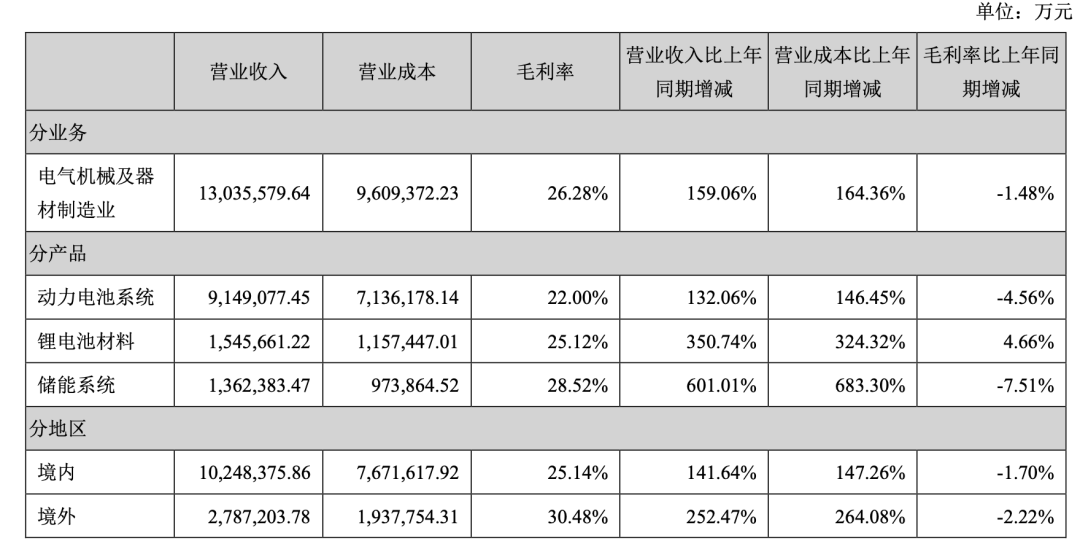 不过,从宁德时代的财报中也可以看到一些问题,如宁德时代的毛利率正在呈现下降趋势。2021年,宁德时代在动力电池方面的整体毛利率为26.28%,同比降低了1.48%,而在最为核心的动力电池的毛利率为22%,同比降低了4.56%;储能业务的毛利率为28.52%,同比降低了7.51%,锂电池原材料成为了宁德时代主营业务中唯一实现毛利率增长的业务。简单来说,宁德时代的赚钱能力正在下滑。