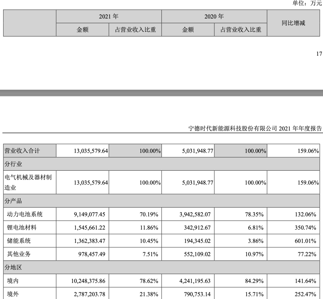 宁德时代2021年财报出炉,营收创新纪录,特斯拉是最大客户。日前,宁德时代正式发布了2021年年度财报。数据显示,宁德时代去年全年营收为1303.56亿元,首次突破1000亿元关口,与去年同期相比增长了159.06%。净利润方面,全年净利润为159.31亿元,同比增长了185.34%。