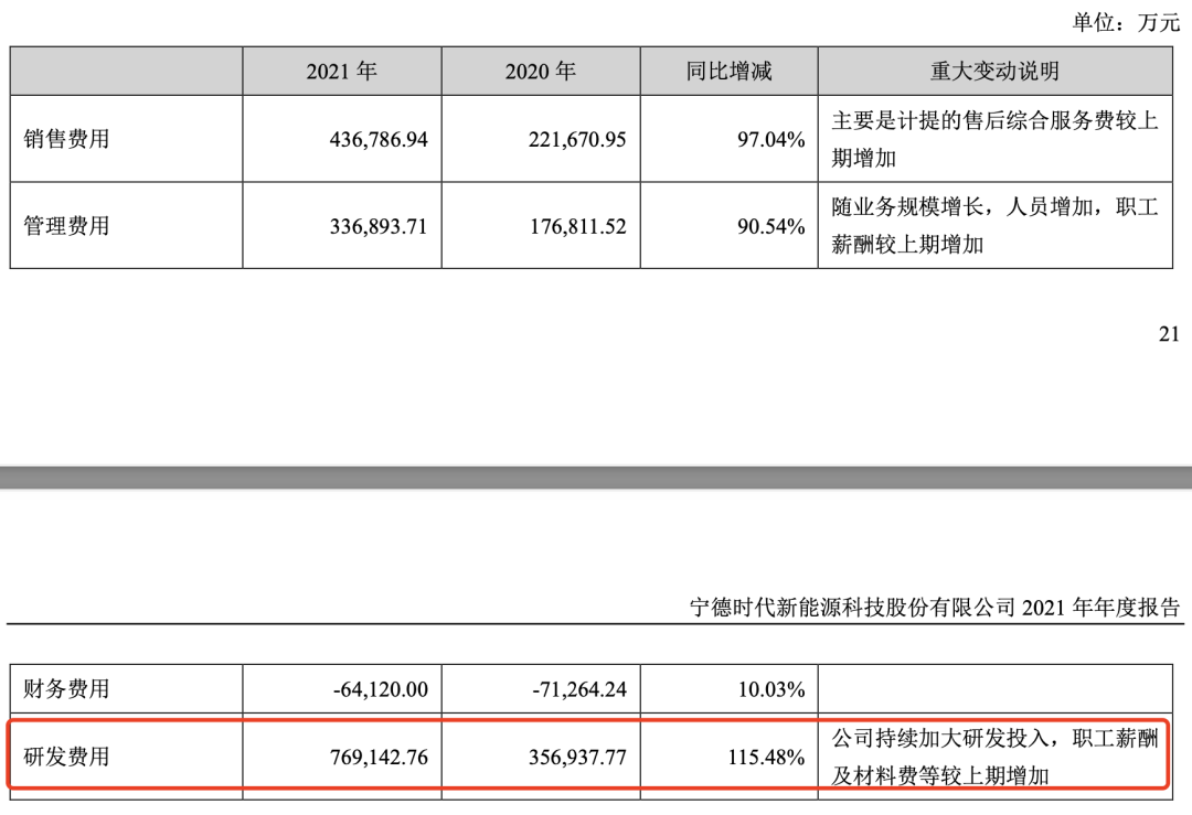 在财报中,宁德时代也公布了自己在研发方面的一些情况。整个2021年,宁德时代在研发方面投入了76.91亿元,同比增长了115.48%。