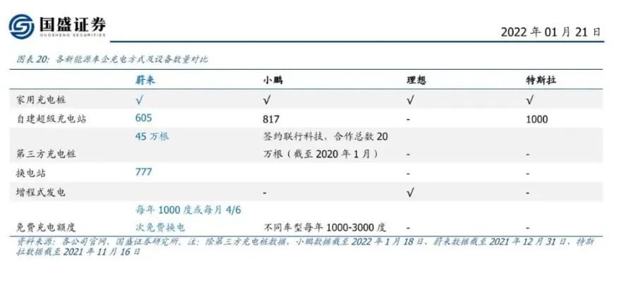 各家虽然车型正在走向融合,但在细节方向如续航及补能上又给出了不同的答案,目前蔚来换电模式在解决电池更新及衰减问题上仍有优势。同时,根据国盛证券统计数据来看,当前蔚来在补能体系的布局规模也远超其余两家。