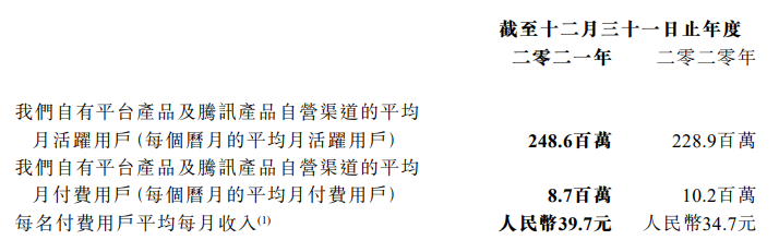 阅文财报显示,2021年其自有平台产品及腾讯产品自营渠道的平均月付费用户是870万,同比减少14.7%,2020年有1020万。