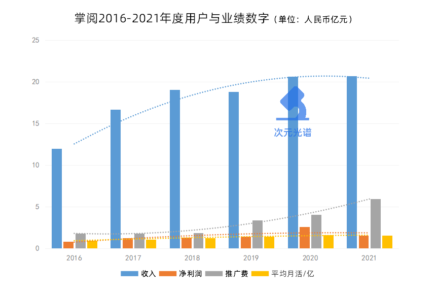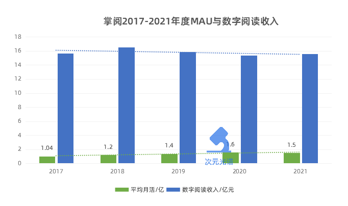 2017年,掌阅的平均月活1.04亿,数字阅读业务收入15.68亿元;2021年,掌阅1.5亿月活对应数字阅读平台收入15.56亿元。用户多了一半,付费还是略微下滑。