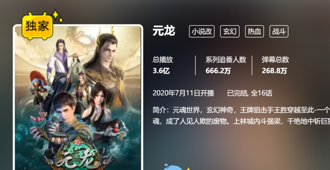 《元龙》动画在B站播放量3.6亿,追番人数666.2万