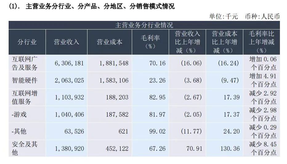 四大主营业务中,只有安全及其他业务的营收同比增长了70.91%,其他三项互联网广告及服务、智能硬件业务、互联网增值服务的收入都有所下降。
