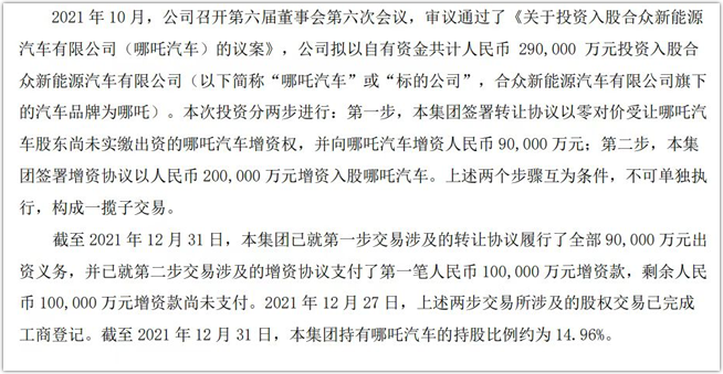 据财报显示,截至2021年12月31日,360集团已就第一步交易涉及的转让协议履行了全部9亿元出资义务,并已就第二步交易涉及的增资协议支付了第一笔人民币10亿元增资款,剩余人民币10亿元增资款尚未支付。2021年12月27日,上述两步交易所涉及的股权交易已完成工商登记。截至2021年12月31 日,360集团对哪吒汽车的持股比例约为 14.96%。