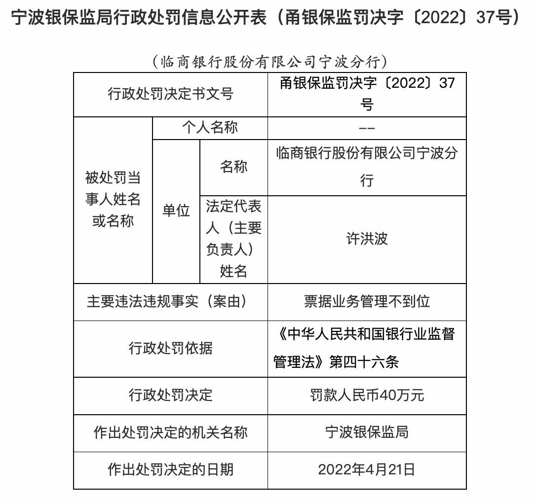 据银保监会网站,宁波银保监局公布的行政处罚信息公开表显示,4月21日,临商银行股份有限公司宁波分行因票据业务管理不到位,被处罚款人民币40万元。