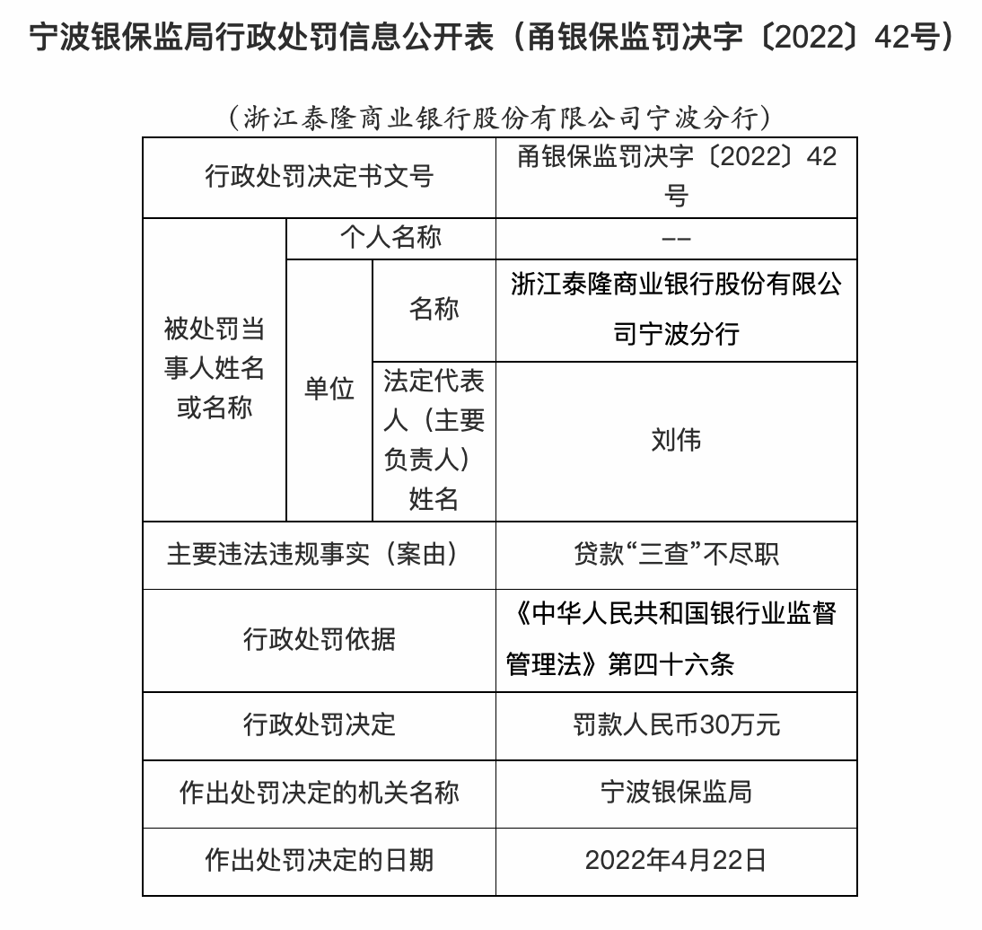 据银保监会网站,宁波银保监局公布的行政处罚信息公开表显示,4月22日,浙江泰隆商业银行股份有限公司宁波分行因贷款“三查”不尽职,被处罚款人民币30万元。