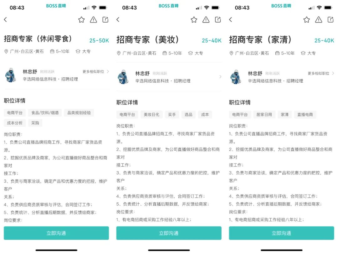 BOSS直聘显示,目前辛选网络信息科技公司还在招休闲零食、美妆、家清三大类目的招商专家,薪资定在25-50K/月,要求八年以上电商招商或采购工作经验。