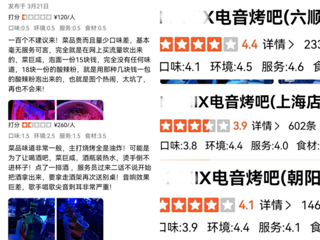 在大众点评搜索主打“夜店风+烧烤”的电音烤吧,一度刷屏小红书和短视频的“用餐时下樱花雨,会下雪”新鲜劲过去,搜索评分,口味项往往比环境项低0.4-0.6分,而槽点往往集中在菜品“性价比低”,有被“割韭菜”的既视感。