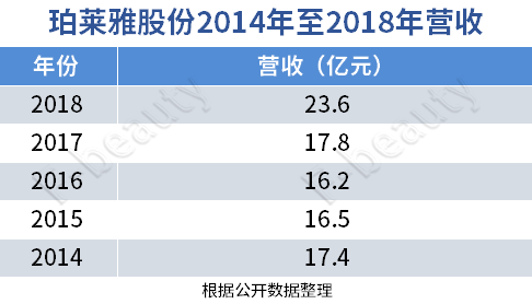 事实上,从2012年到2017年的五年间,珀莱雅集团的电商很一般,这也导致营收规模一直在17亿元左右徘徊,甚至在2015年和2016年,由于上市前的调整,CS渠道竞争加剧,营收还出现了小幅度下滑。