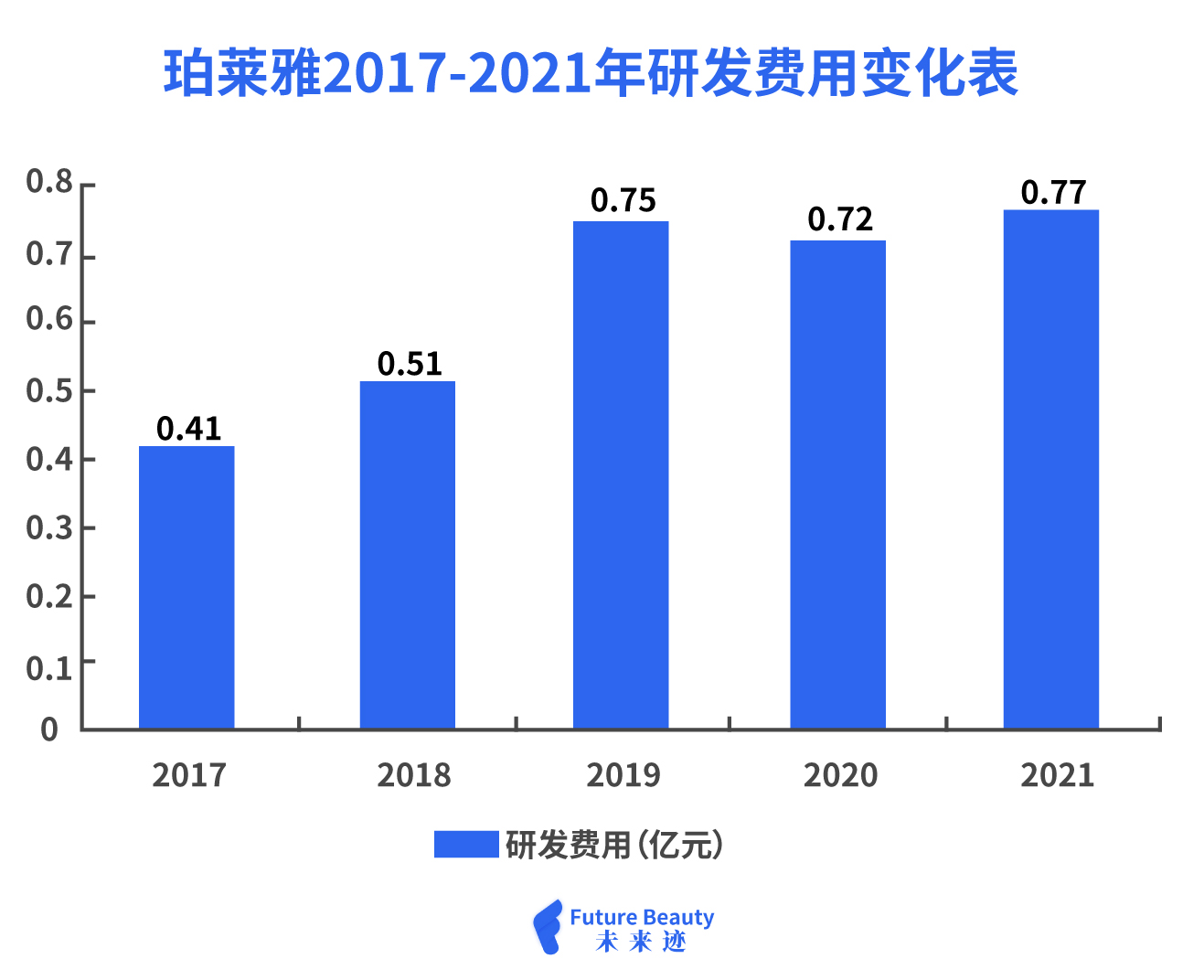 梳理珀莱雅股份近5年的研发费用变化,2017年到2019年研发费用在营收中的占比明显提高,2020年和2021年,随着销售爆发,研发费用的占比暂时下降,但绝对金额已经在2017年的基础上几乎翻倍。