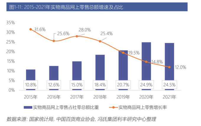 根据中国百货商业协会和利丰集团日前联合发布的《2021-2022中国百货商业报告》,2021年,电商在中国实物零售中的占比已经见顶并小幅度回落。可以说,电商的高光时刻已经过去。