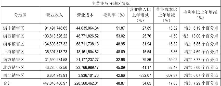 分产品来看,除进口葡萄酒外,有机葡萄、传统葡萄酒干型酒、传统葡萄酒甜型酒、传统葡萄酒汽泡酒、葡萄蒸馏酒、白兰地的毛利率较去年均有所增加,综合毛利率为48.87%,同比增加7.29个百分点;分地区来看,威龙葡萄酒最重要的浙中、浙西、浙东销售区营收较去年均有所上涨,增幅在30%左右。