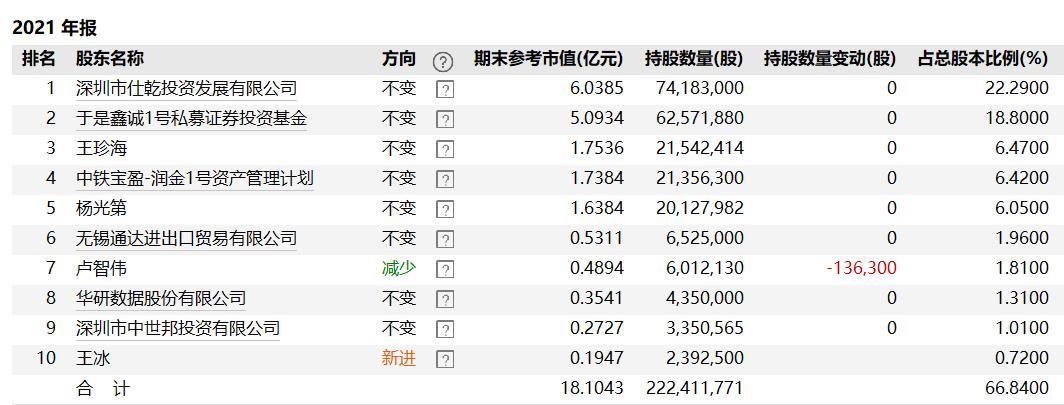 由于原控股股东王珍海持有的公司6264万股股份(占其持有公司股份74.41%,占公司总股本18.81%)被于是鑫诚一号私募证券投资基金(下称“于是鑫诚”)通过司法拍卖取得,经此权益变动,威龙股份第一大股东为深圳市仕乾投资发展有限公司及其一致行动人何平、王勉、深圳市中世邦投资有限公司(合计持有公司股份7859万股,占比23.61%),于是鑫诚成为第二大股东(持有公司股份6264万股,占比18.81%)。
