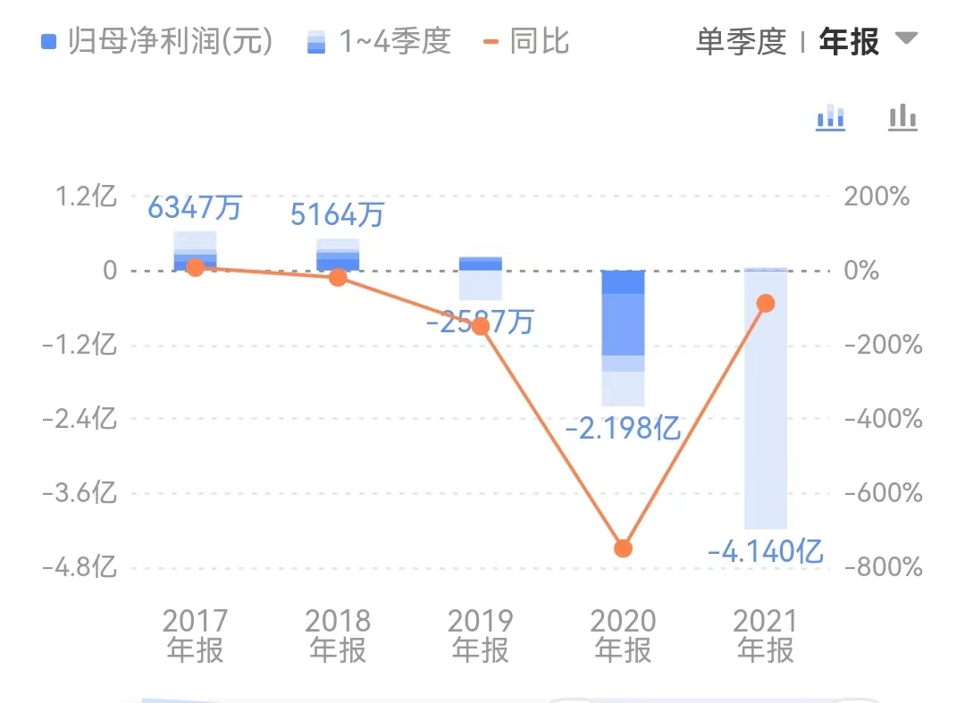 近年来,威龙股份的业绩并不理想:2019年威龙股份净利润为-2587万元,系上市以来首次出现亏损;2020年和2021年,公司净利润分别为-2.2亿元和-4.1亿元,亏损金额呈翻倍式增加。