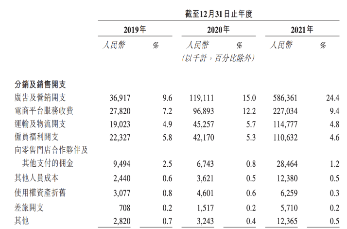 据蕉下提供的招股书数据显示,从2019年到2021年,近三年其广告及营销开支分别达到了3691.7万元、1.19亿元和5.86亿元,分别占到了总收入的9.6%、15.0%和24.4%。
