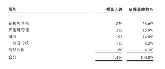 在研发团队的配置上,据招股书中显示的情况来看,蕉下的研发团队仅有197人,占总员工数的14%,而与此同时,营销团队的人数达到826人,占比58.6%,做营销的人数是技术研发人数的4倍多。