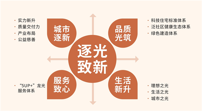 2021年,面对房地产行业的调整大潮,龙光深度践行企业责任,积极应对时局之变,始终坚持聚焦主业和区域深耕战略,强化精细化运营管理,提升产品市场竞争力、保障高质量如期交付。在大时代背景下,龙光集团广西区域以勇毅笃定步伐,深入时局洪流;立足发展新起点,以向上之姿主动拥抱变化,焕新发布2022品牌主张——“逐光致新”,以多元的新力量,赋能城市美好,绽放向上新光芒。